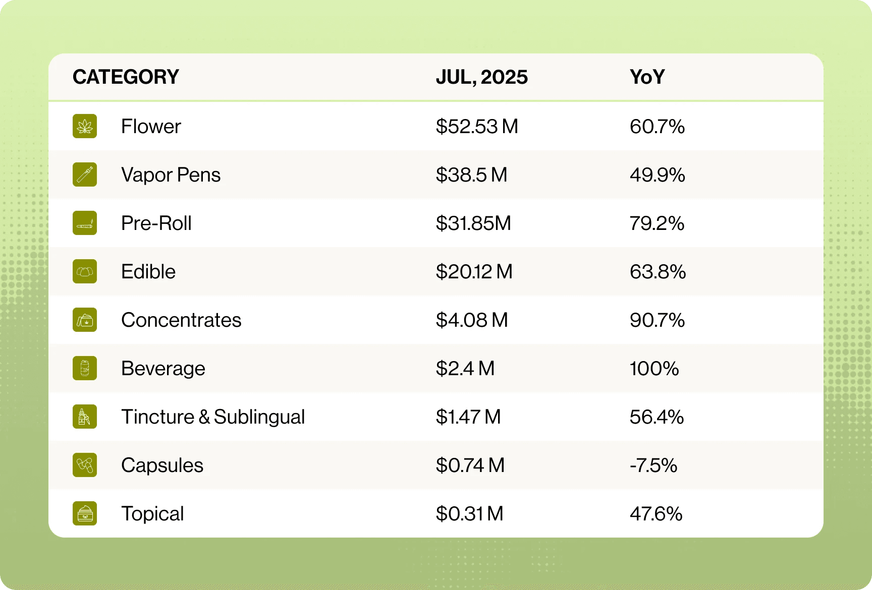 Flowers remain New York's largest product category, with a 35% market share and approximately $31 million in sales in February 2025. Vaporizer cartridges hold 27 % share ($25 million), and pre‑rolls capture 17 % share ($16 million), reflecting the popularity of convenient, shareable formats. The high share for pre‑rolls suggests that consumers value ready‑to‑smoke options over loose flower. Beverages and edibles remain small but rapidly growing niches, particularly among new consumers seeking discrete experiences.