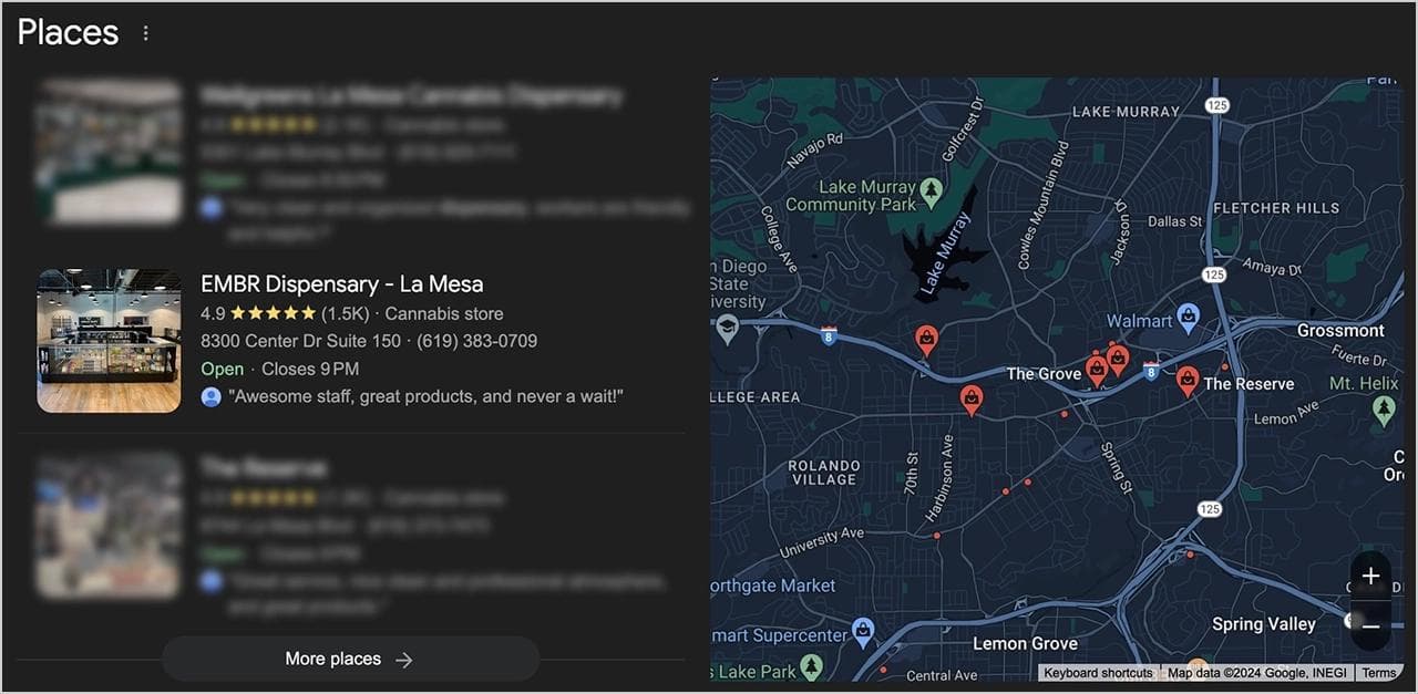 - Mobile map prominence when customers search "dispensary near me," triggering the map pack that appears above organic results