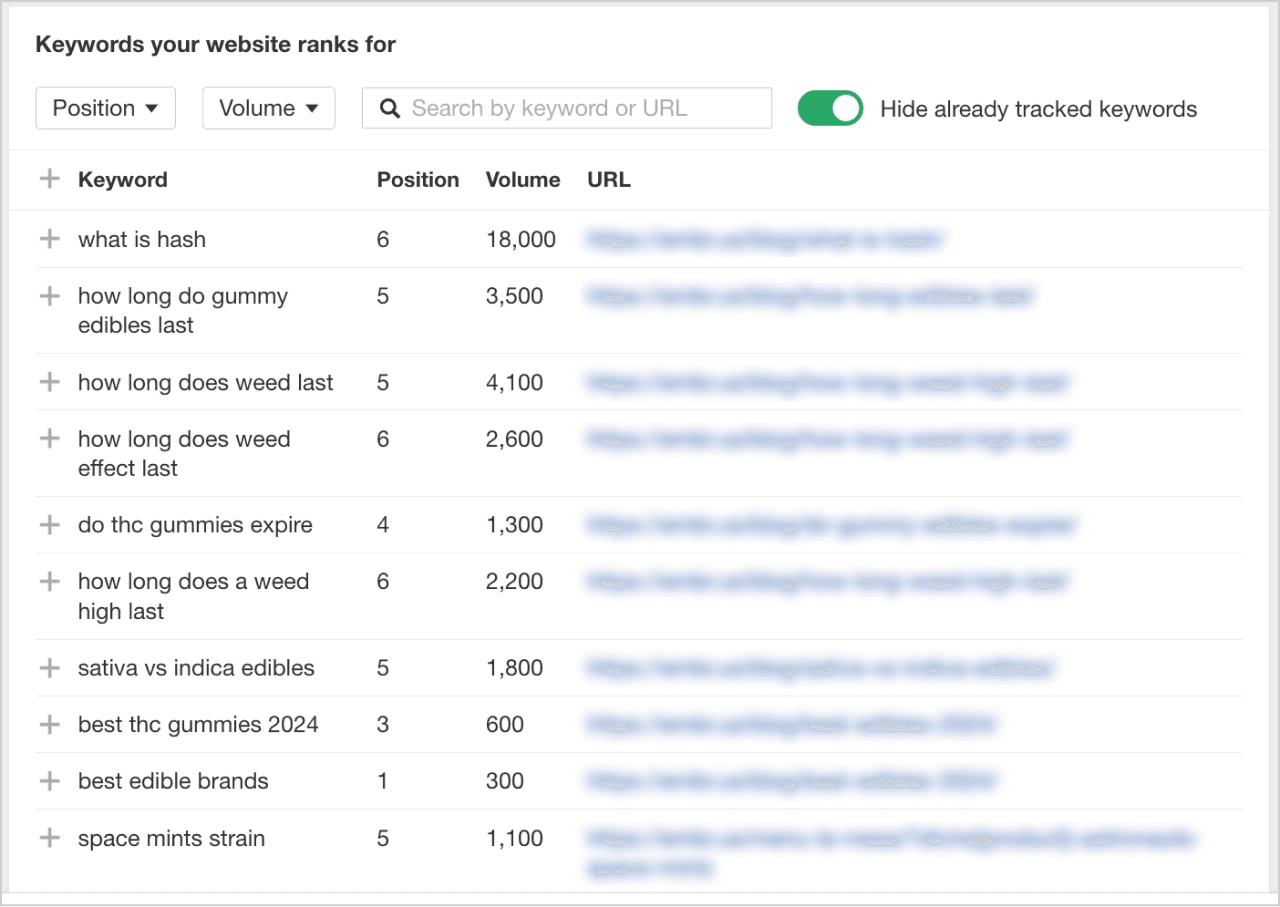 Long-tail keywords like "best thc gummy for sleep" have lower search volume but higher conversion rates. These are your growth opportunities, especially when starting.