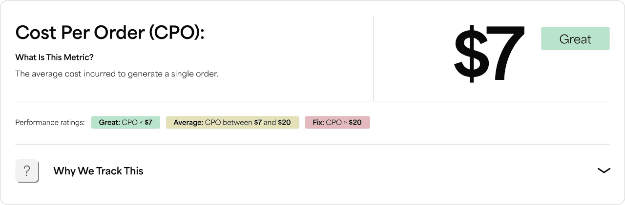 CPO = Total Monthly Marketing Spend / Total Monthly Orders