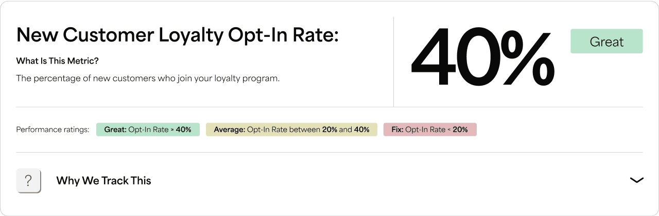 New Customer Loyalty Opt-In Rate measures the percentage of first-time customers who join your loyalty program during their initial visit.