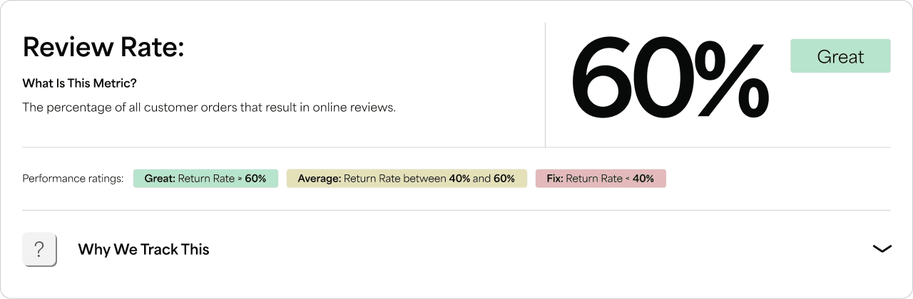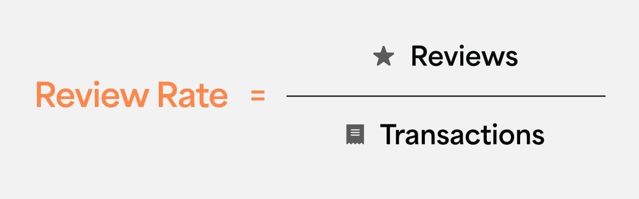 Calculate the Review Rate by dividing the total reviews by the total transactions and multiplying by 100. For example, if you receive 50 reviews from 100 transactions, your Review Rate is 50% (50/100 × 100 = 50%).
