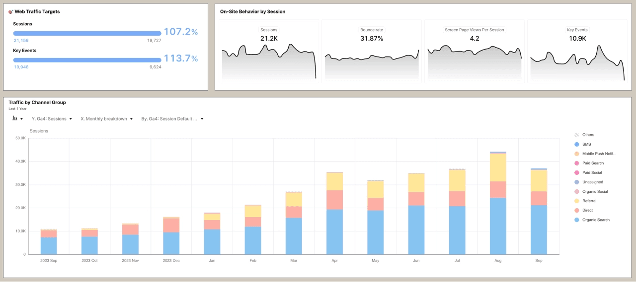 We recommend reviewing your KPIs at least monthly, with more frequent checks on critical metrics like organic traffic and conversions.