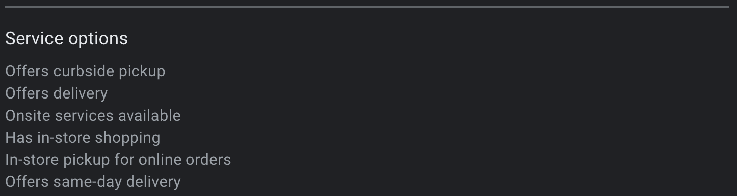 - Service Attributes: Highlight "Online Orders," "Curbside Pickup," and "Delivery" (where available)