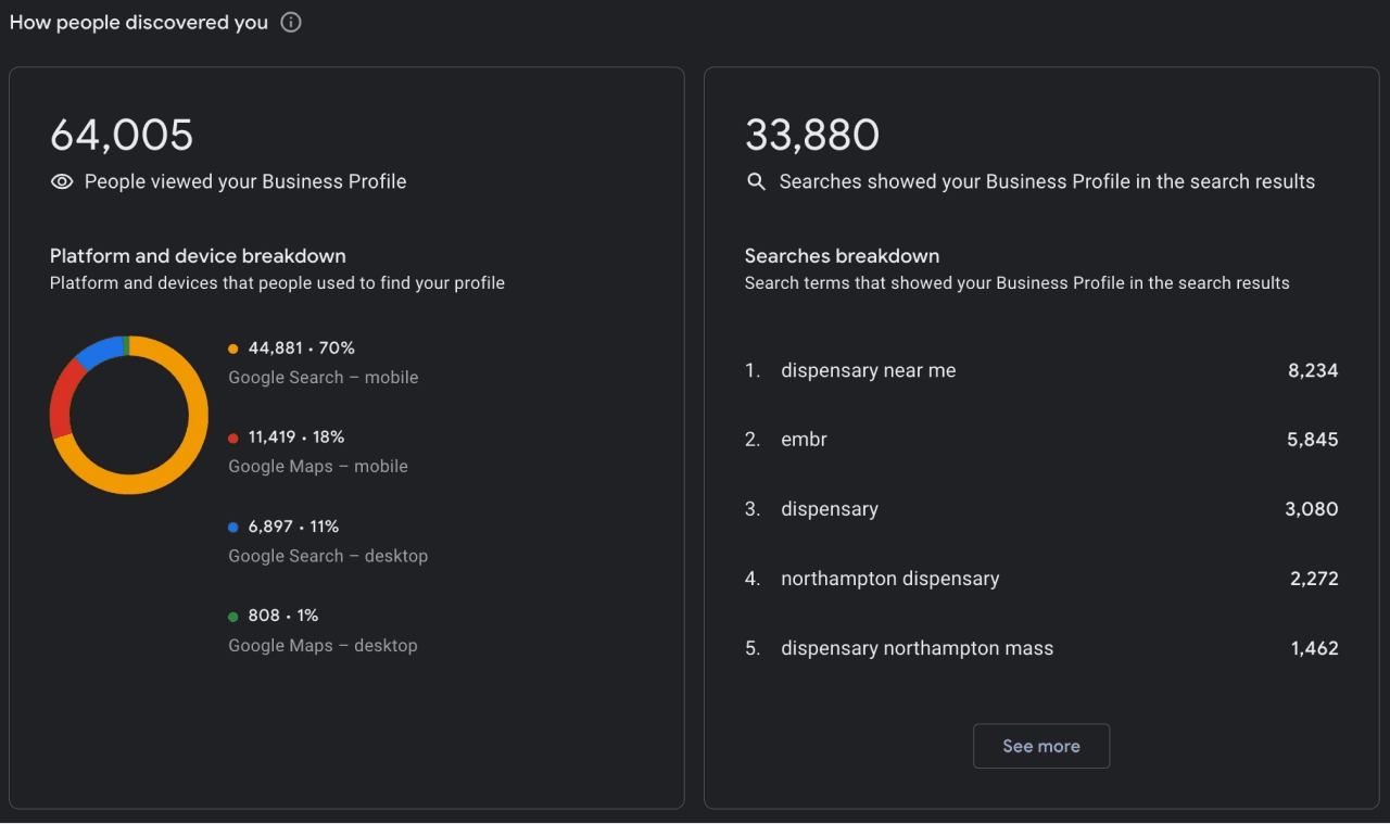 - Performance Metrics: Track calls, direction requests, website clicks, and search appearances