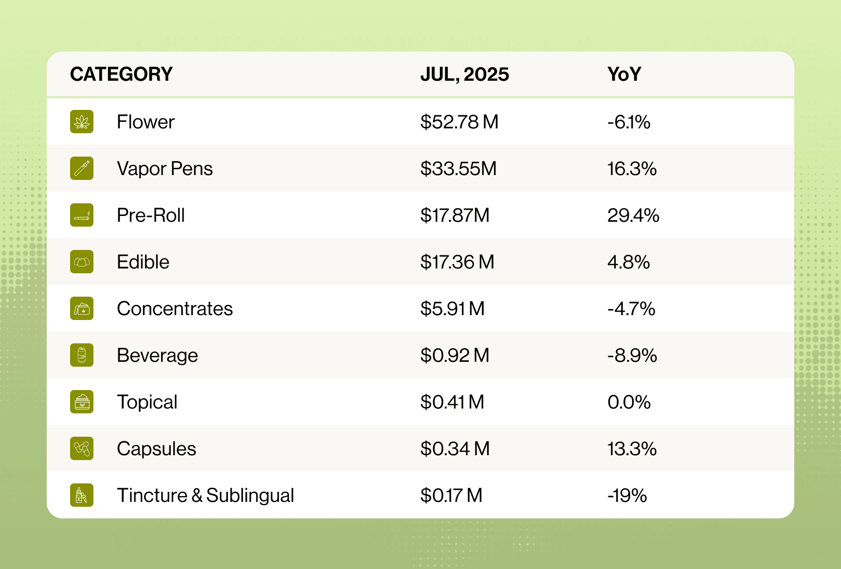 Vaporizers are the state’s second-largest category, reflecting consumer demand for convenience and ready-to-use products. They’re especially popular among newer users and cross-border shoppers who want simple, discreet, portable options. Featuring well-branded vaporizers, cartridge displays, and bundle deals can help drive higher attachment rates for this category.